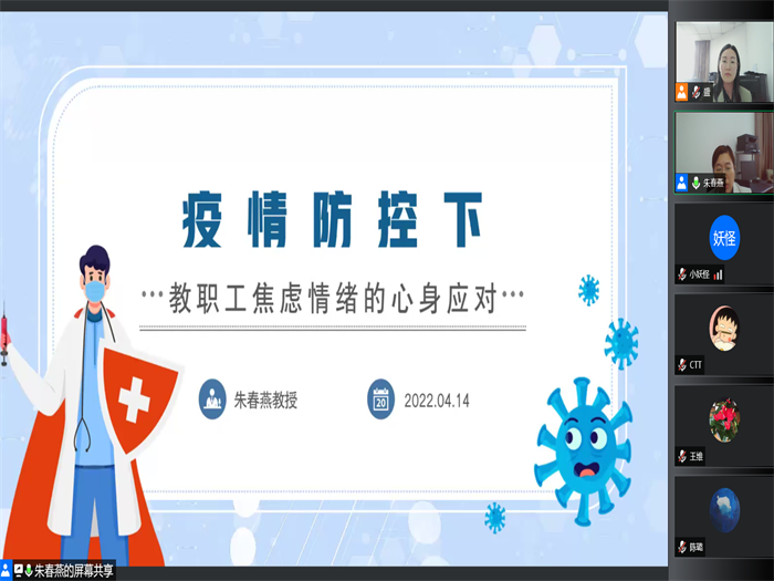 4月14日,校教职工心理健康服务中心邀请伟德体育官网副院长朱春燕教授,以“疫情时期的焦虑情绪应对”为主题,为全校职工开展了一场线上公益讲座,提醒广大教职工做好“心理防疫”。全校500余名教职工线上参加活动。