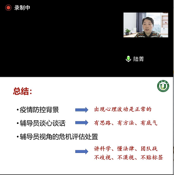 10月25日,教职工心理健康服务中心与大学生心理健康教育和辅导中心联合举办辅导员技能提升专题讲座。邀请江苏大学心理中心副主任陆菁为我校全体辅导员开展主题为《疫情防控下辅导员如何与学生谈心谈话》线上讲座。